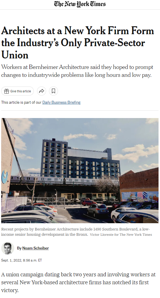 Exciting news as BA workers have had a their union voluntarily recognized, forming the only one of it’s type at a US-based architectural firm. Congratulations to everyone at BA on this accomplishment.