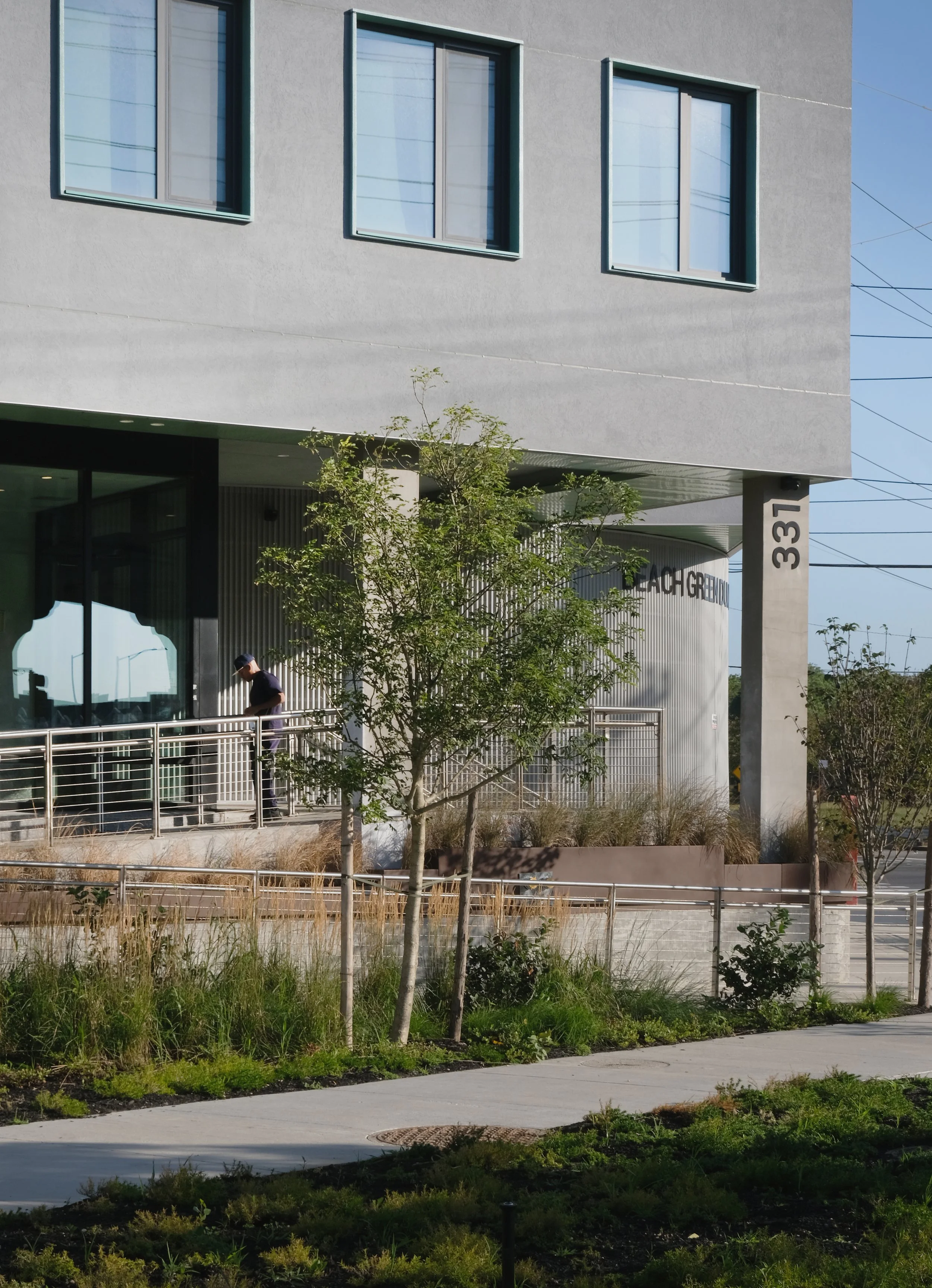 Given the site’s vulnerability to flooding, strong winds, and protracted loss of power in future storms, all exacerbated by accelerating climate change and sea level rise, resiliency was a primary design consideration. To mitigate flooding, the first floor has been elevated six feet above the surrounding streets and a series of ramps, stairs, and planted berms surround the building and extend under it at the recessed first floor to soften the transition between the lower public spaces and the flood-protected building interior. Additionally, the project deploys storm swales, porous paving, and rain gardens and green roofs with integrated stormwater retention to help mitigate storm flooding on site and in the surrounding neighborhood.